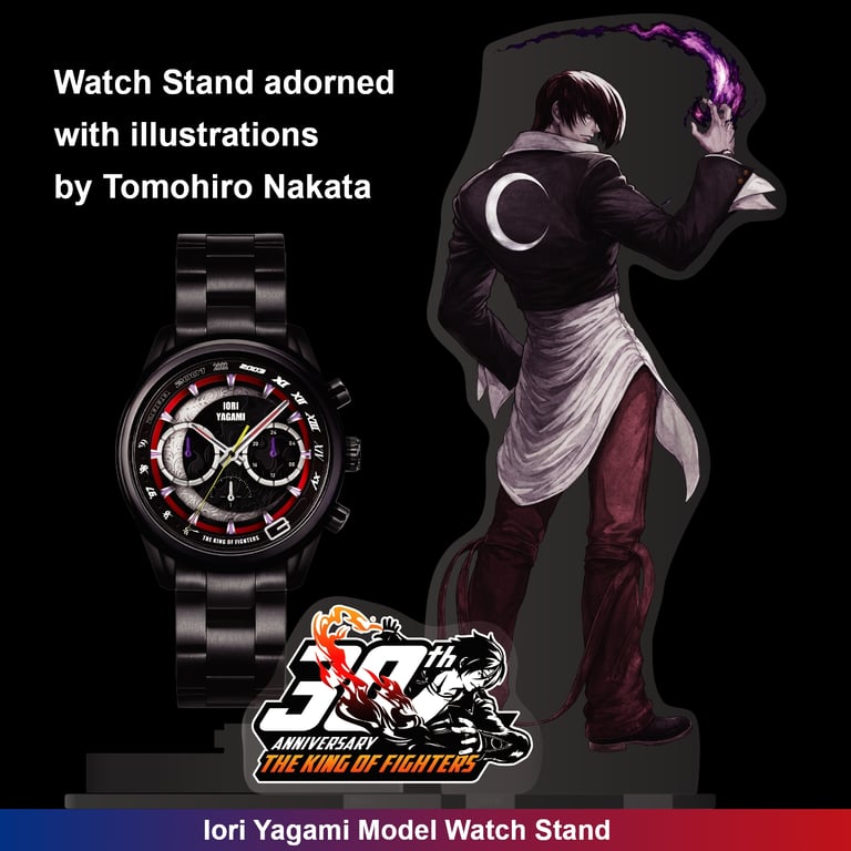 A special watch stand utilizing illustrations of Kyo Kusanagi and Iori Yagami wearing the watches.